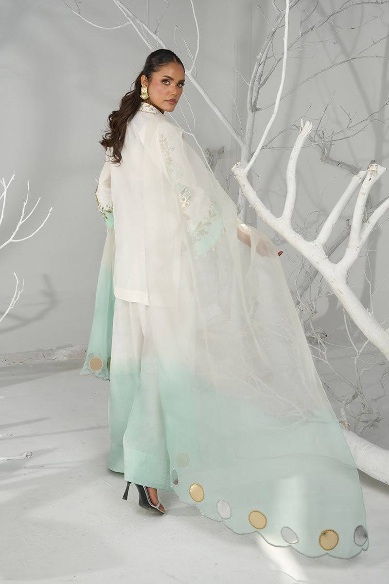 This stunning Mint & White Ombre effect Shalwar Kameez is hand-crafted with intricate Zardoze embroidery and our Signature leather applique and cut-work. Adorned with crystals, beads and pearls for a statement look. Comes with a dip-dyed Farshi Shalwar. Paired With Dip Dyed matching dupatta featuring our signature letaher applique motifs To Complete The Look (optional).
