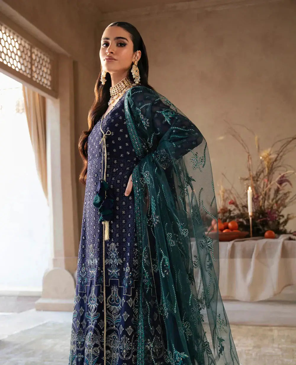 Radiate sophistication in this regal Blue 3-piece set from Xenia Formals, Yesfir 24. The chiffon shirt is adorned with intricate embroidery, featuring front and back yokes for a structured look, paired with detailed sleeve and border patches. An embroidered net dupatta adds a touch of delicacy, while the raw silk trouser completes the ensemble with elegance. Ideal for weddings and festive occasions, this outfit combines timeless style with modern refinement.