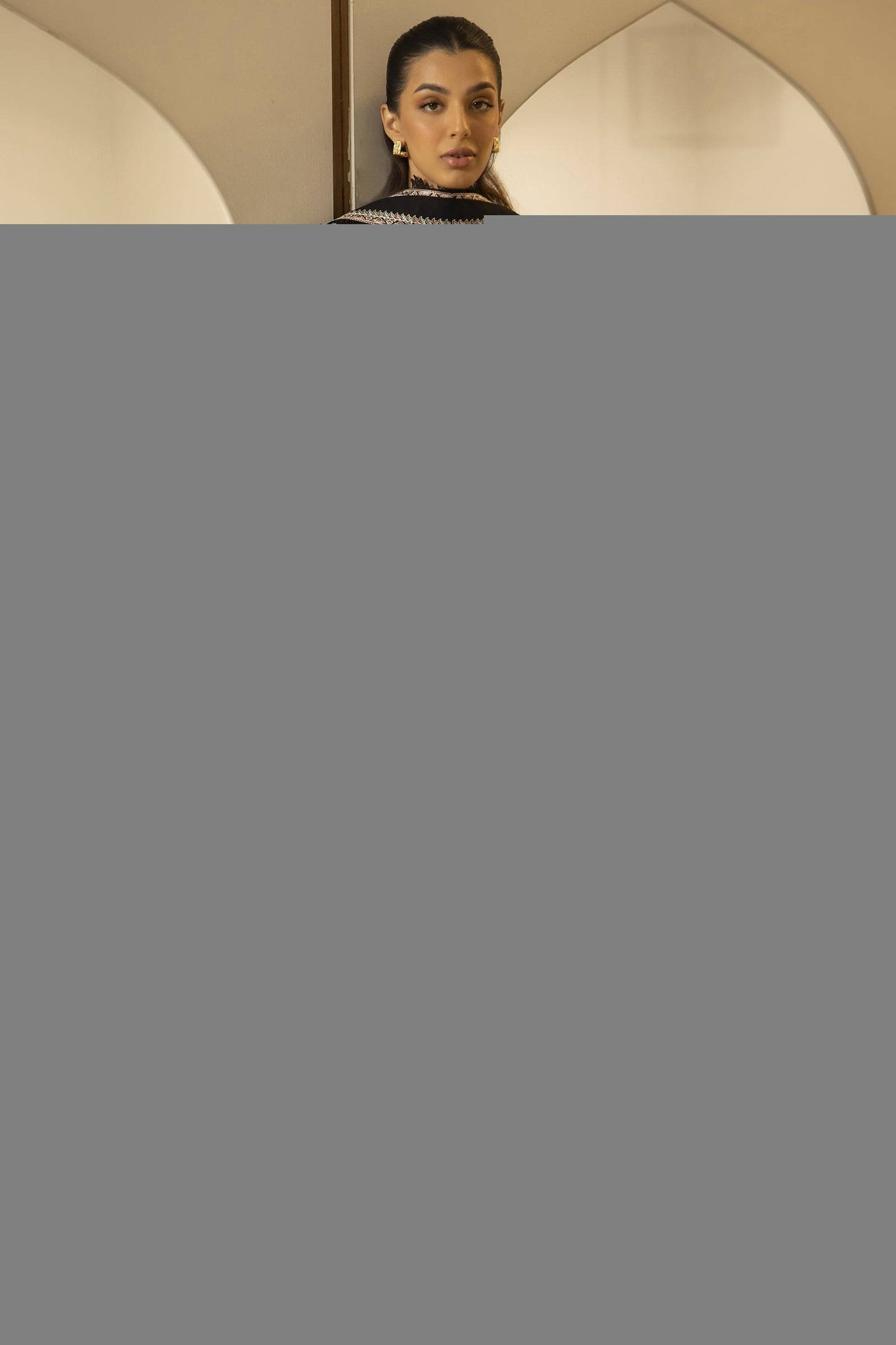In the depths of midnight, 'Elania' emerges, a canvas of ebony adorned with celestial ivory threads weaving a sublime embroidered tapestry. A captivating fusion of paisleys, florals, and ethnic motifs adorns the shirt, accentuated by intricate side panels and a delicate hem border. Paired with a weightless dupatta adorned with a swirling festoon, 'Firuzeh' embodies a sophisticated aesthetic reminiscent of classical aristocratic elegance, making a statement that resonates with timeless style sensibilities.