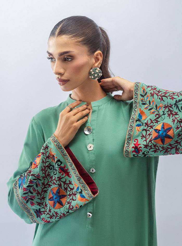 Discover effortless grace in our mint escape 2 piece embroidered set. The flowing kurta, adorned with beautiful sleeve embroidery, creates a striking yet elegant look. Complete with matching trousers, this versatile outfit is designed for refined comfort.