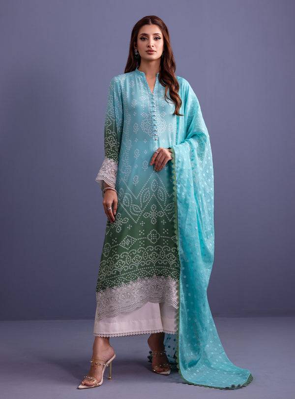 At the heart of this ensemble is a Pure Silk shirt, adorned with a mesmerizing digital print in refreshing mint and green hues. The sleeves and daman of the ensemble are adorned with a delicate embroidered border crafted from ethereal organza fabric. Complementing the shirt are Victoria raw silk pants, boasting a refined elegance with their GPO finishing. To complete the look, a dupatta made from mix khadi net fabric with GPO finishing adds a touch of lightness and grace.