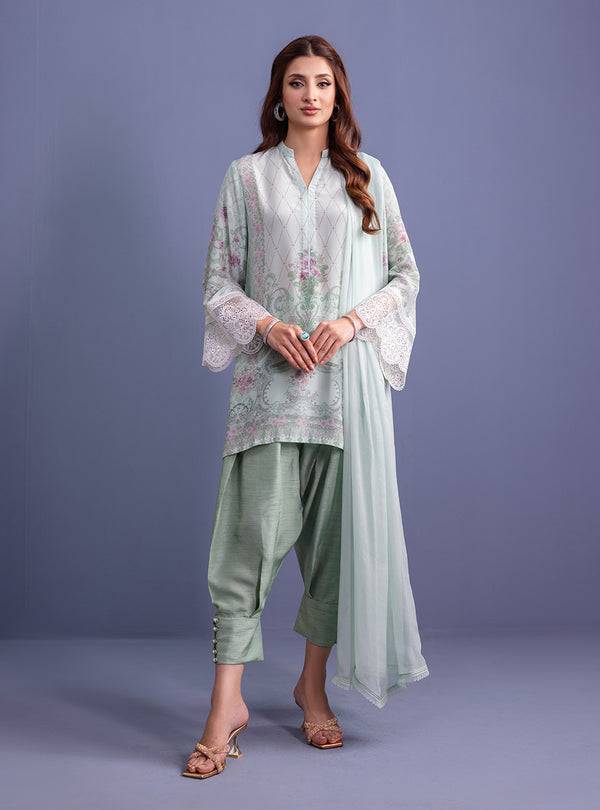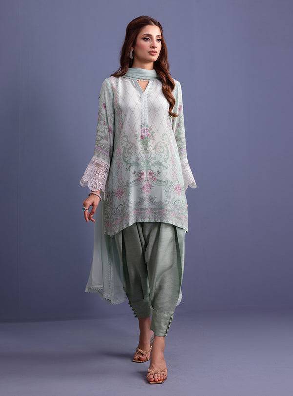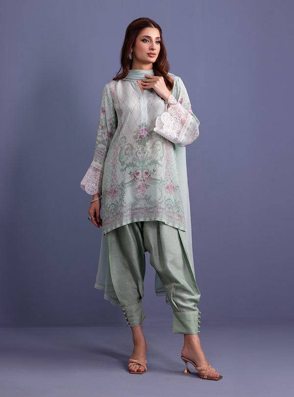 Wrap yourself in elegance with this exquisite ensemble, where delicate details and luxurious fabrics come together seamlessly. The sleeves feature intricate embroidered borders on ethereal organza fabric, adding a touch of charm to the look. The Pure Silk shirt boasts a refreshing mint digital print, exuding modernity with grace. Paired with smooth Victoria raw silk shalwar, the ensemble offers refined elegance.