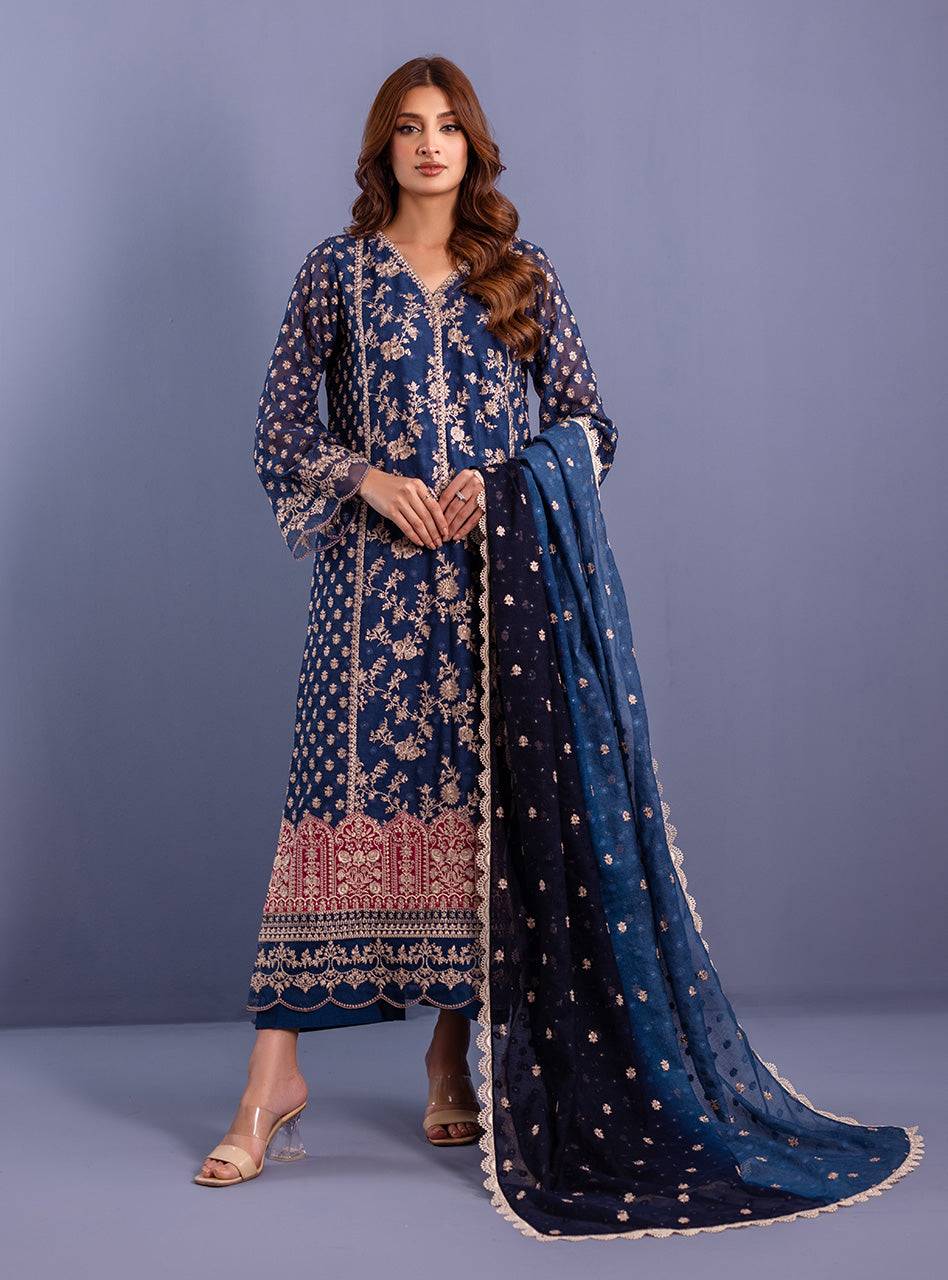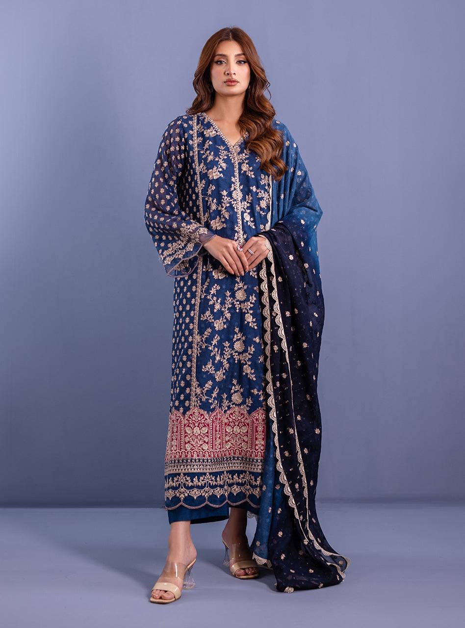 The deep midnight blue hue sets a mesmerizing backdrop for the delicate embroidery that adorns the shirt, tracing intricate patterns along the neckline, sleeves, and hem. Complementing the shirt is a matching Khadi net dupatta, exquisitely crafted with sheer fabric that drapes effortlessly over the shoulders. Paired with the shirt and dupatta are sleek Viscose pants, offering comfort and versatility without compromising on style.