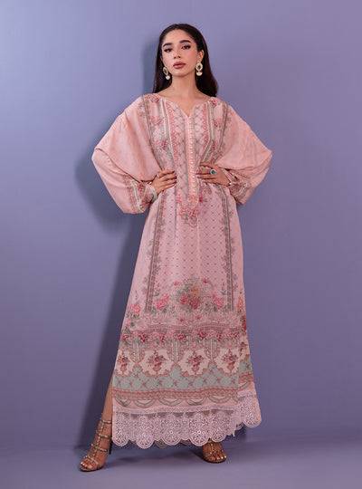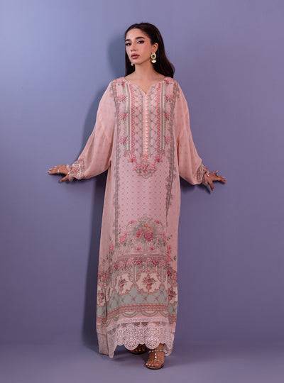 Indulge in the epitome of sophistication with this enchanting ensemble, where luxurious fabrics and intricate details come together in perfect harmony. The centerpiece of this ensemble is the Pure Silk kaftan, adorned with a mesmerizing digital print in shades of pink. Adorning the sleeves of the ensemble is an exquisite embroidered border crafted from delicate organza fabric.