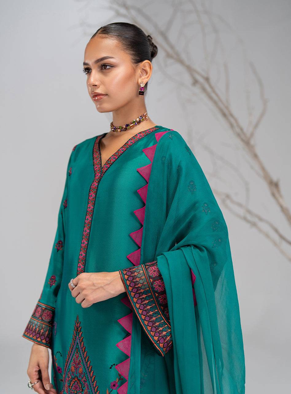 Discover pure luxury with this elegant creation from our pret collection. Made from rich silk, the shirt features elaborate all-over embroidery, exuding opulence. The ensemble is completed with a soft, flowing chiffon dupatta, offering a sophisticated and comfortable drape. Paired with silk pants.