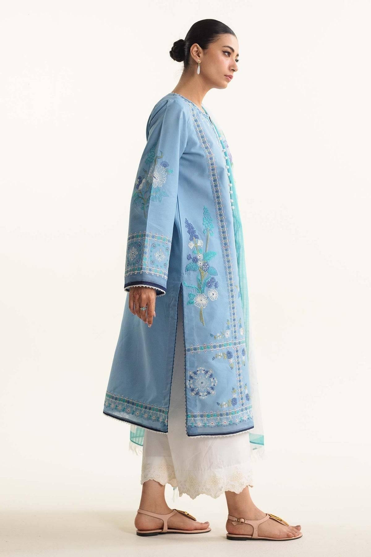Dahlia embraces elegance in this blue ensemble with intricate embroidery and luxurious organza patches. Its digital floral dupatta and cambric pants, complete this timeless masterpiece.