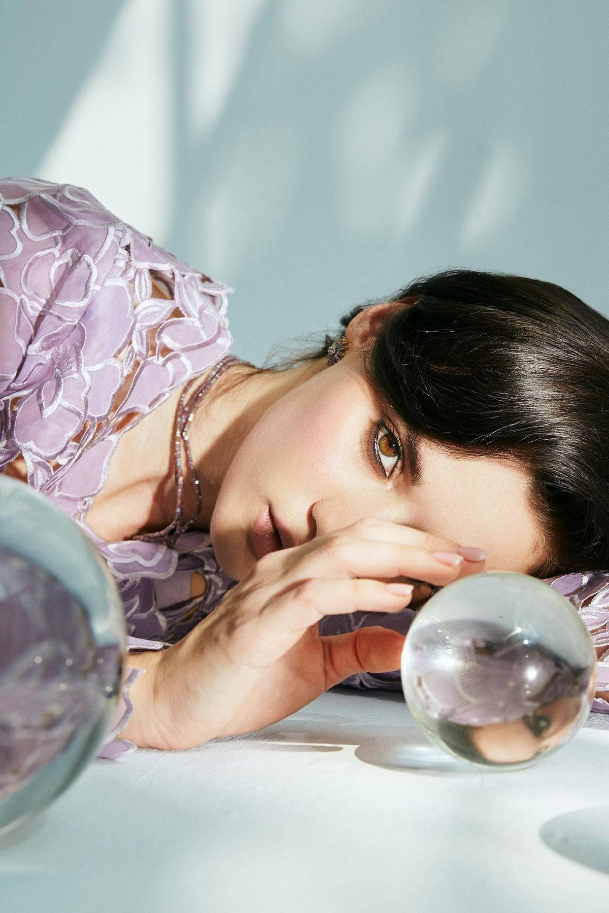 A stunning lilac ensemble features exquisite cutwork on the front, back, and sleeves and is styled with a thin strap slip, straight trousers, and a silk-finished dupatta.