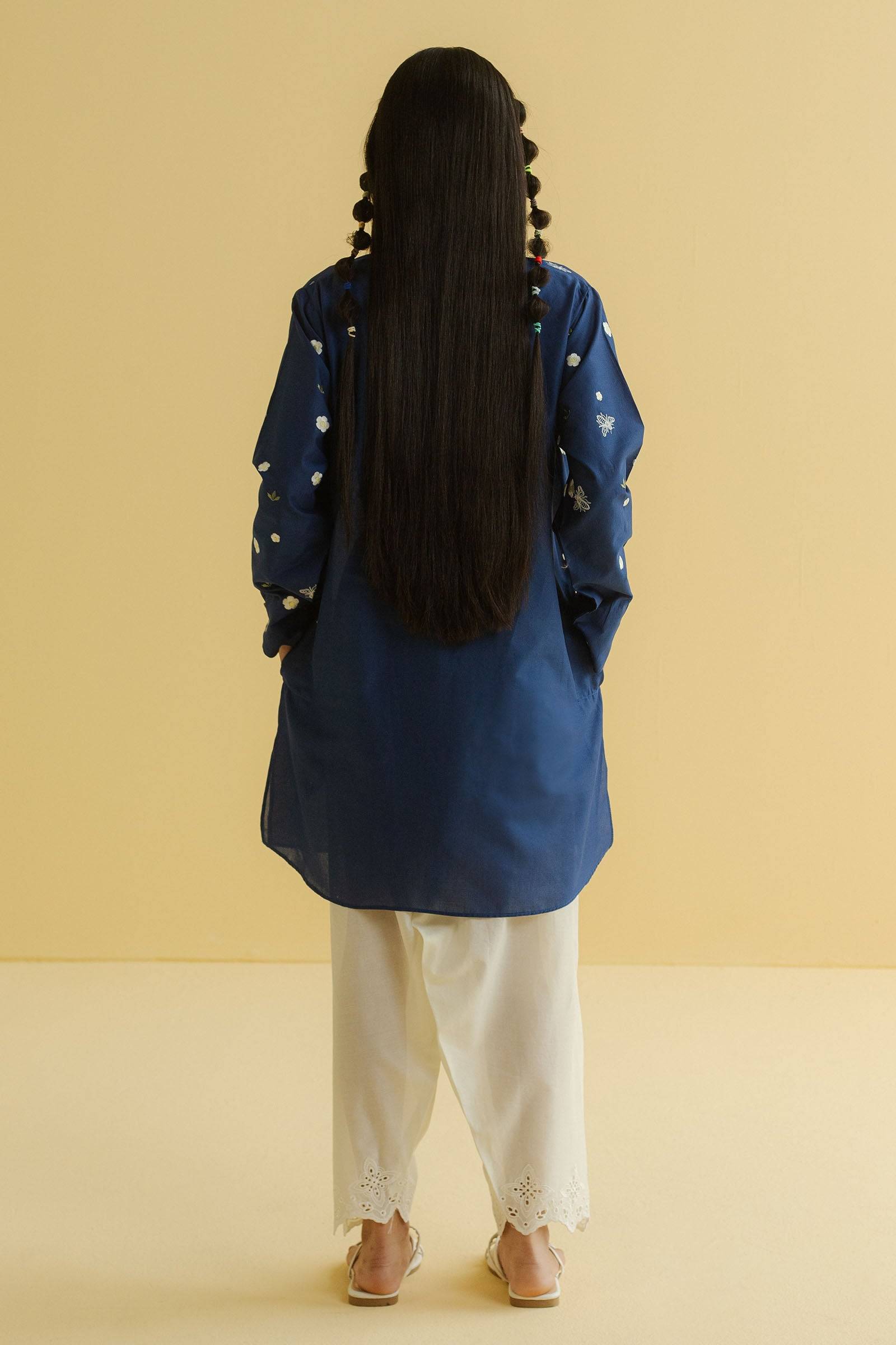A charming blue lawn kurta from Zara Shahjahan’s Love Coco SS 25 collection. The loose-fit silhouette is comfortable and airy, while intricate honey bee embroidery scattered across the fabric adds a playful and elegant touch, perfect for effortless summer styling.