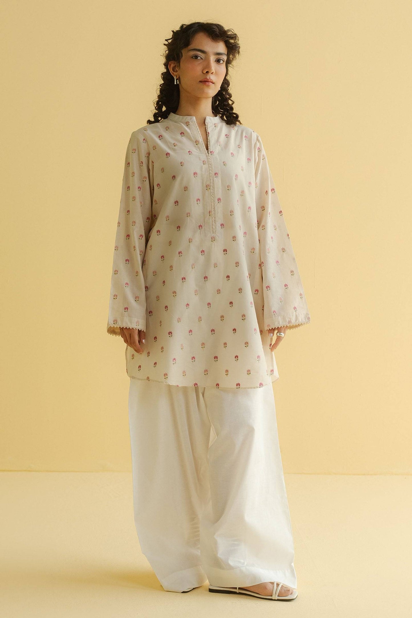 A soft warm beige lawn kurta from Zara Shahjahan’s Love Coco SS 25 collection. This short, loose-fit silhouette is comfortable and breezy, adorned with delicate all-over floral embroidery for a charming, effortlessly stylish summer look.