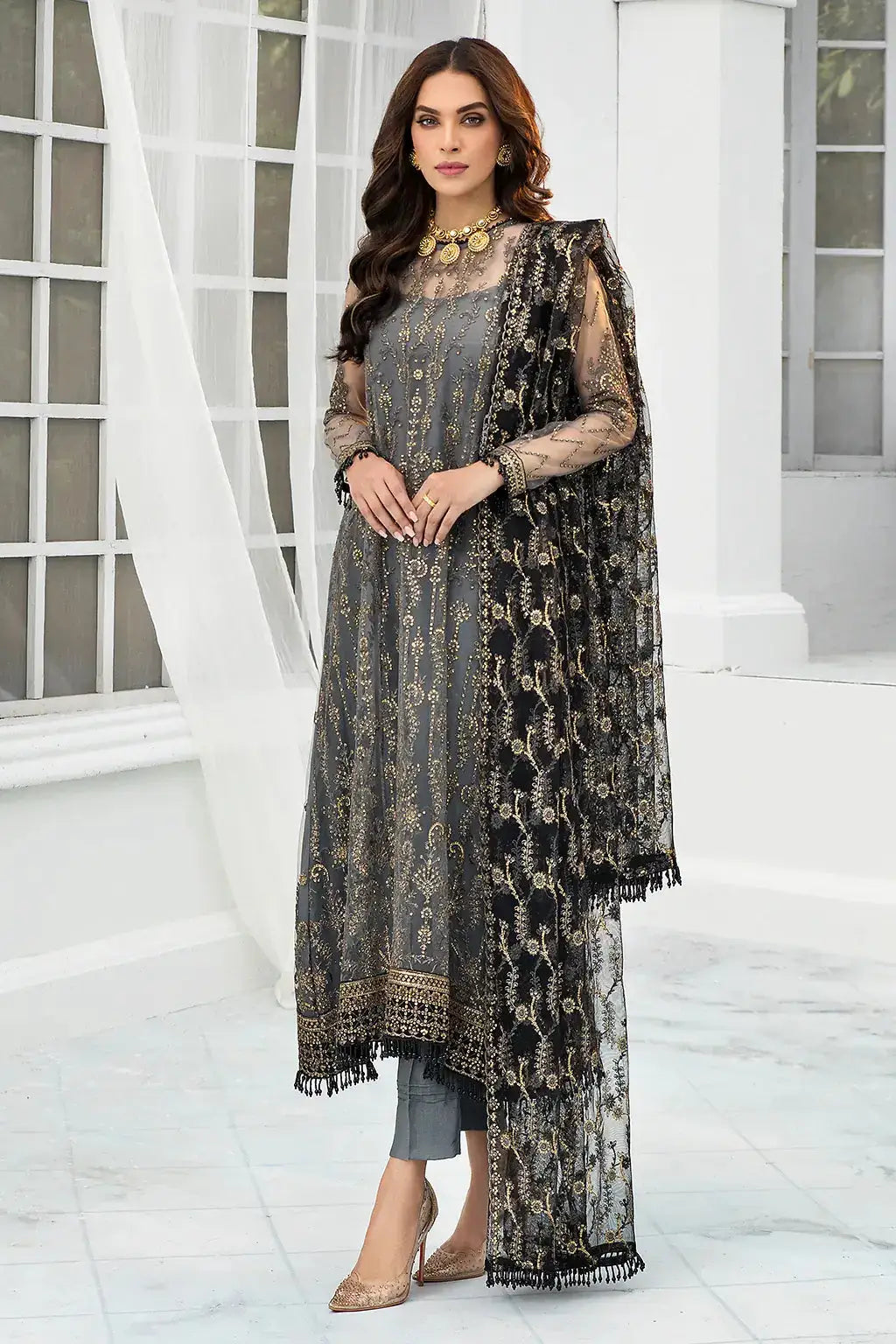 Elevate your formal wardrobe with this Zarif ensemble from the DE LUXURY Formals Collection. The net shirt features sequins embroidery on the front, back, and sleeves, with contrast sequins embroidered lace on the front, back, and sleeves. The contrast sequins embroidered net dupatta enhances the luxurious appeal. Paired with a dyed raw silk trouser, this outfit is ideal for weddings, festive occasions, and formal gatherings.