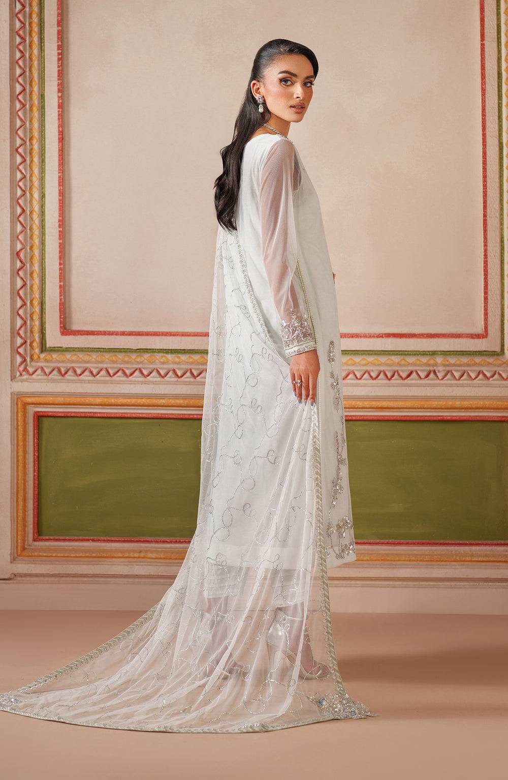 Showcase sophisticated charm with this Zarif ensemble from the Falesia Formals Collection. The net shirt is hand-embellished on the front and sleeves, with a plain back for refined elegance. The sequins embroidered net dupatta is enhanced with four hand-embellished corner pieces, paired with a dyed raw silk trouser for a polished and luxurious look. Ideal for weddings, festive gatherings, and formal occasions.
