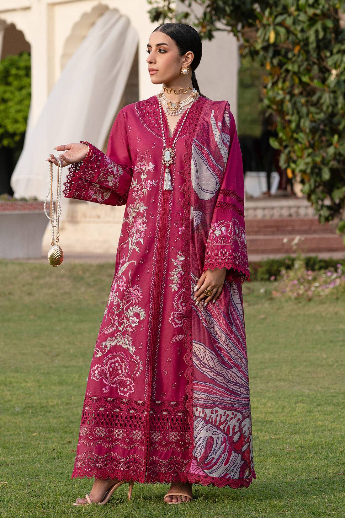 A graceful three-piece outfit from Zarposh’s Celia Luxe collection. The lawn shirt is designed with embroidered side panels, sleeves, and back, refined with organza borders for an elegant touch. The printed silk dupatta introduces a modern flair, while the dyed cotton trouser with an embroidered organza border completes the outfit, making it a versatile and timeless choice for festive occasions.
