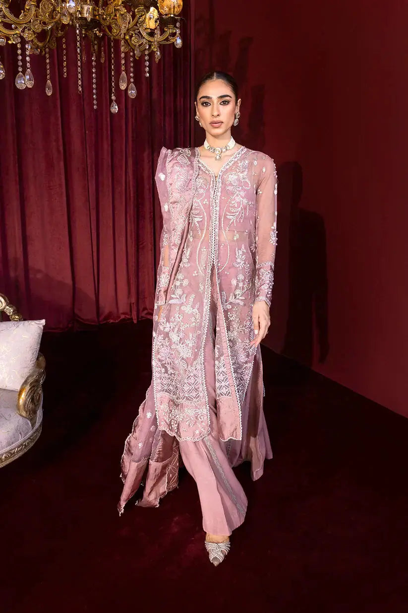 A regal lavender ensemble from Zarposh’s Lamhay Wedding Formals collection. The shirt features organza front panels embellished with intricate adda work, paired with an organza back and sleeves also adorned with adda work. Silk borders on the front, back, and sleeves elevate the design, while the dupatta combines silk palu and border with a Zari organza base for a luxurious finish. The dyed raw silk trouser completes this elegant, wedding-ready look.