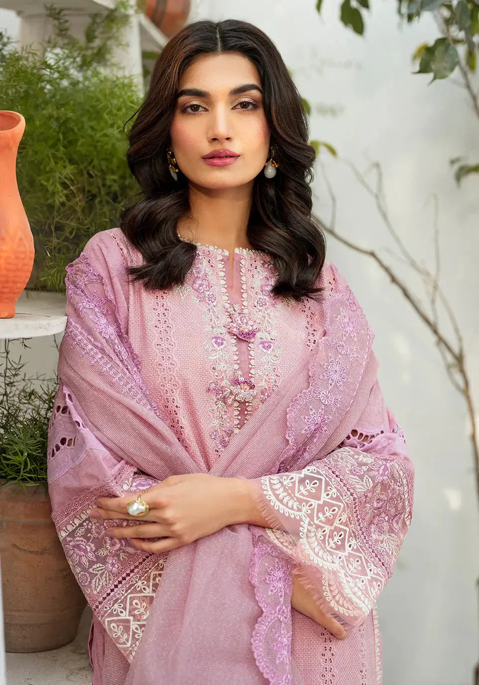 A classically elegant look 'La Rose features a beautifully adorned hemline and sleeves with schiffli embroidery, cut from a beautiful shade of rose pink self-embroidered lawn, delicately adorned with an eyelet panel decorated with hand embellished vintage floral rosettes. The neckline is enhanced with scalloped embroidery and delicate lace trimmings further embellished with hand crafted 3D organza flowers. The elegant tunic can be paired with cropped pants highlighted with lace trimmings and a classic cotton net embroidered dupatta.