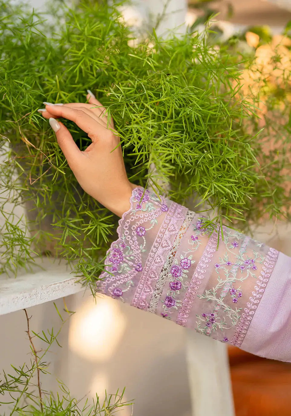 A sublime lilac canvas weaves a tale of florets and folios, as 'Periwinkle embraces an exquisite embroidered composition adorned with fine Tankas in shades of lavender, mauve, blush sage and ivory, while eyelet details dance with meticulous precision. Can be paired with a light -as -air digital printed dupatta, adorned with embroidered floral vines, and embroidered scallops and our signature embroidered pants. This look unfolds with ultra-feminine twists, elevated textures, and accents of luxurious grandeur.