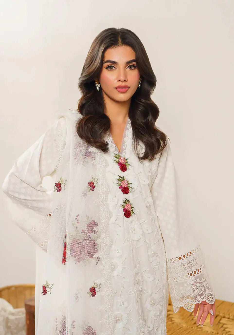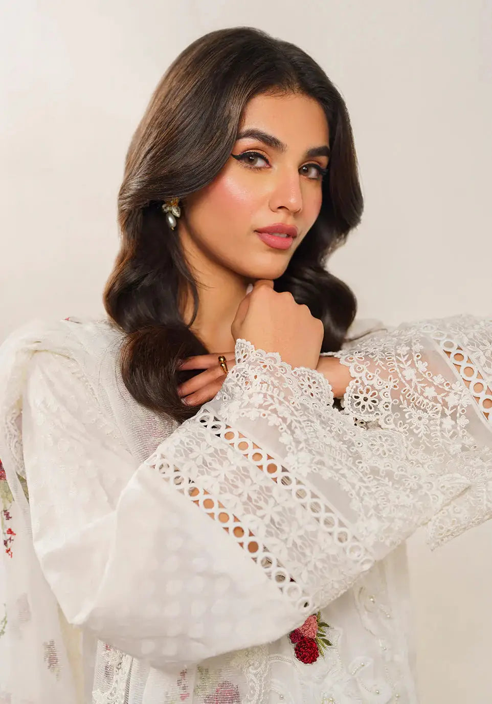 Super feminine, beautiful and perfectly detailed this paneled tunic will make you stand out, it is absolutely ideal for the upcoming spring/summer soirees. The silhouette is crafted from self-embroidered lawn delicately adorned with eyelet panel and borders accentuated with laces and embroidered border decorated with floral embroidery. The Center panel is embellished with handmade 3D flowers, sparkling crystals, oyster pearl and thread work, the neckline is further enhanced with handmade bullion stitch rosettes. This lovely ensemble can be paired with our signature cotton pants with embroidery and lace inserts. Style this tunic with a classic cross stitch embroidered dupatta, this ensemble epitomizes timeless allure.