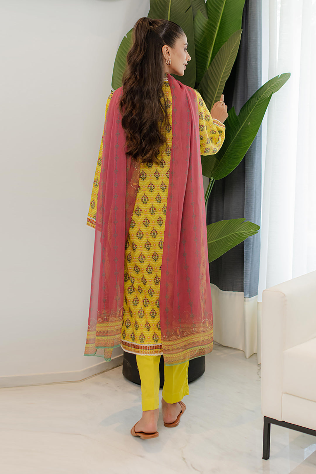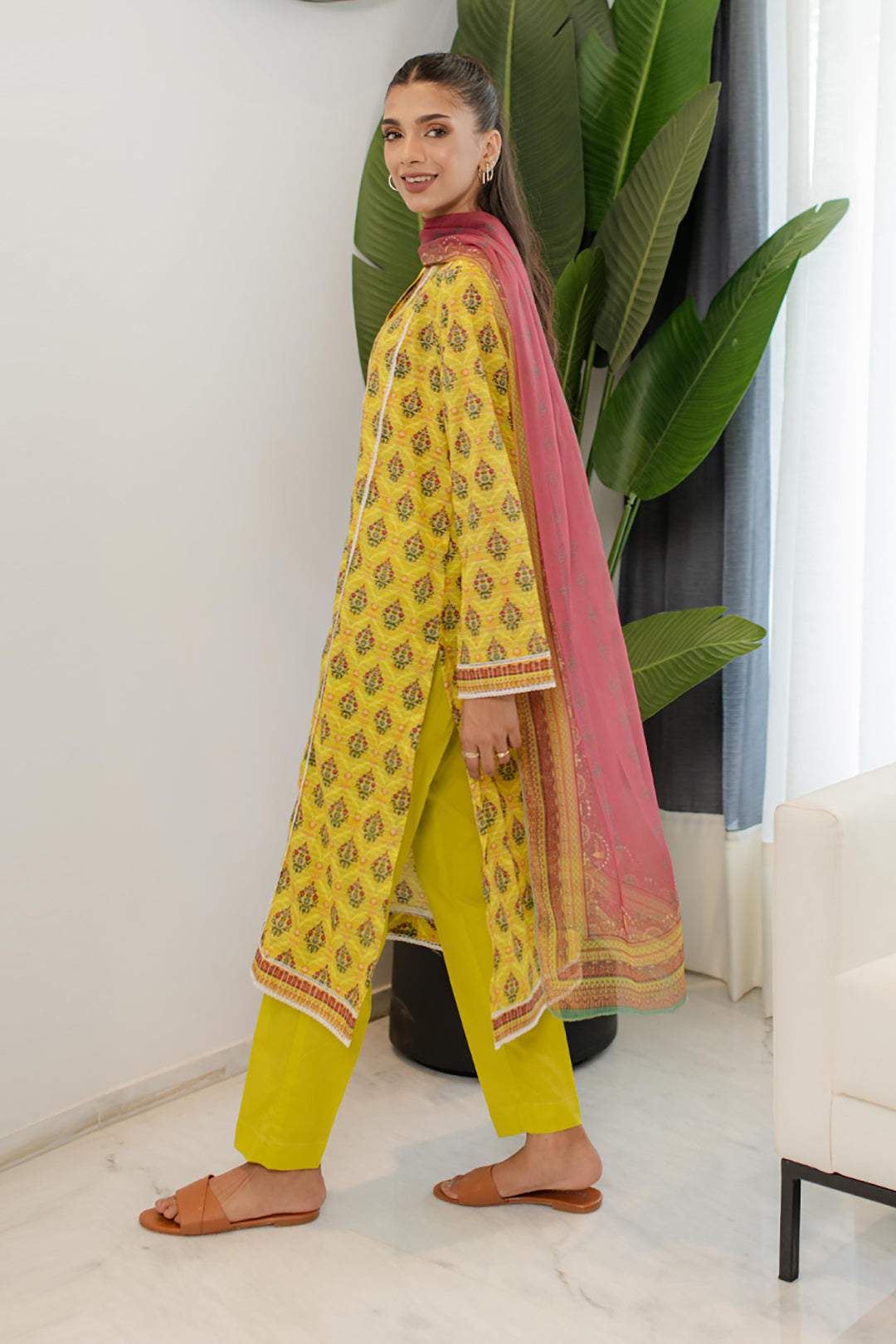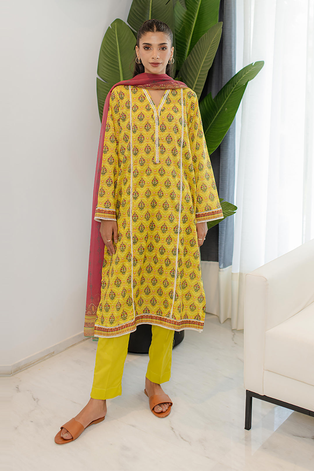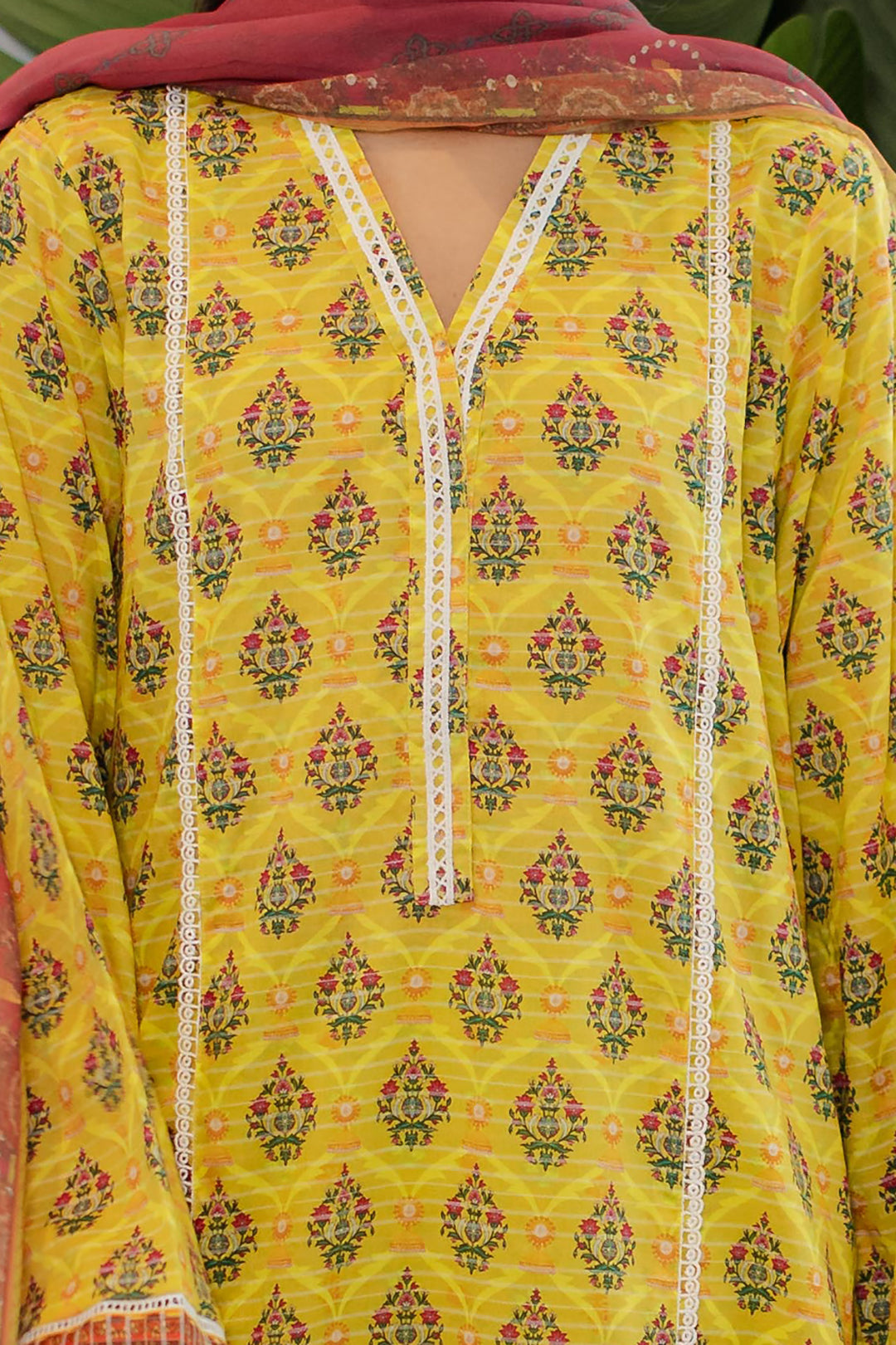 Enhance your wardrobe with this stylish Kurta Dupatta Trouser set (printed, fabric: lawn) for women. This versatile and comfortable outfit (color: yellow) is perfect for everyday wear or special occasions. Add a touch of sophistication with this Pret collection (1746) in English.