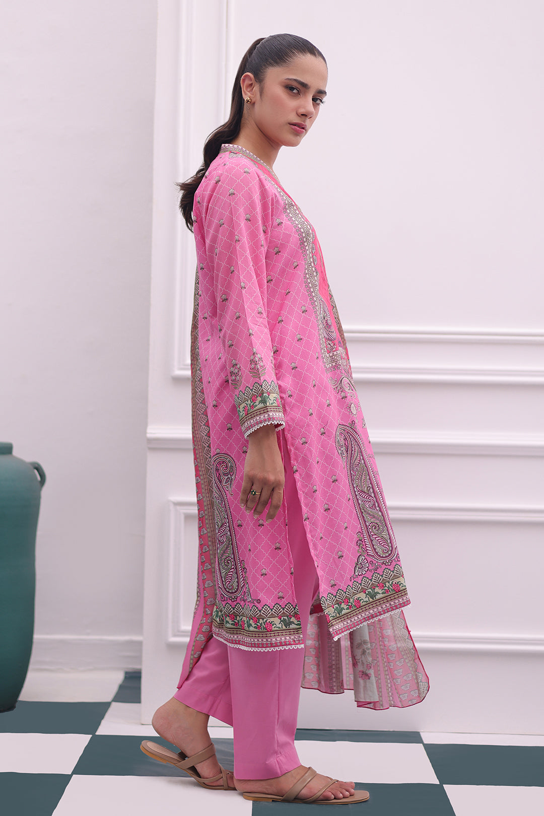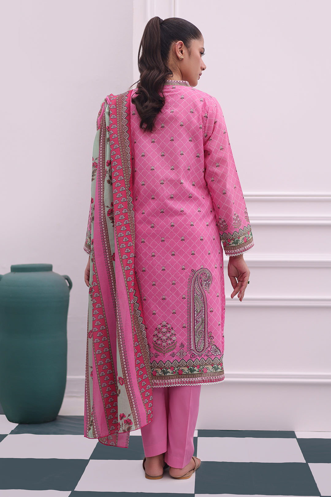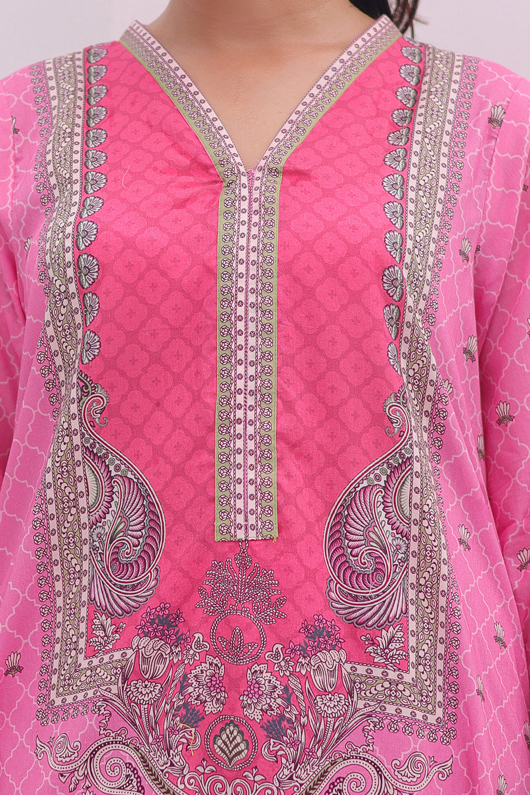 Experience comfort and style with our Kurta Dupatta Trouser - 2106. This printed ensemble, made from high-quality lawn fabric, is designed for the modern woman. Elevate your look with the beautiful pink color and effortlessly stand out. Perfect for any occasion, this pret set is a must-have in your wardrobe.