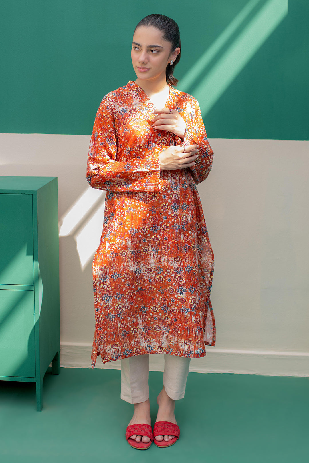 Expertly designed Printed Kurta for women, made with premium quality Khaddar fabric in a stunning Rust color. This Pret Kurta is perfect for any occasion, providing both style and comfort. Elevate your wardrobe with this versatile and fashionable piece.